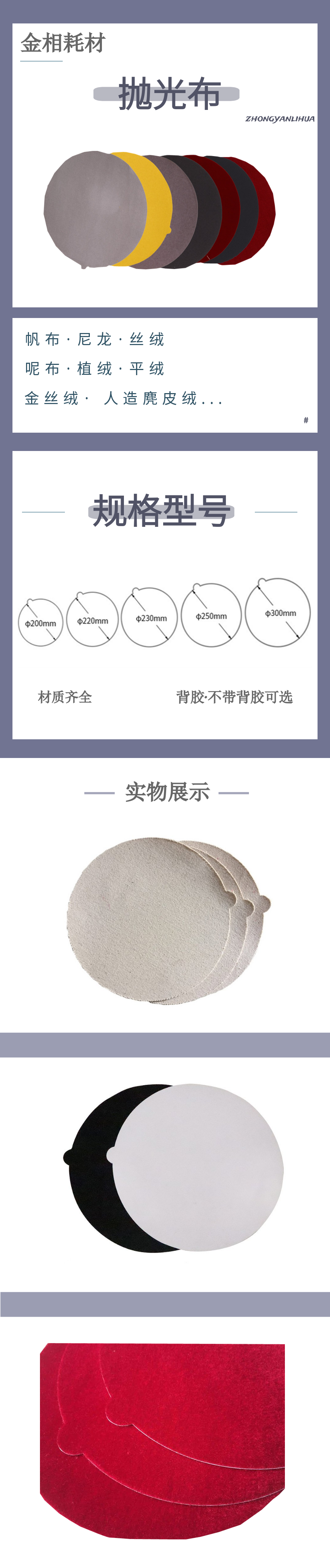 1.無膠普通使用時(shí),直接放置在拋光盤上,用壓圈扣住即可 2.帶膠粘貼拋光盤使用,可將拋光織物直接固定在拋盤上,采用高檔壓敏膠制成,拋光布平整, |